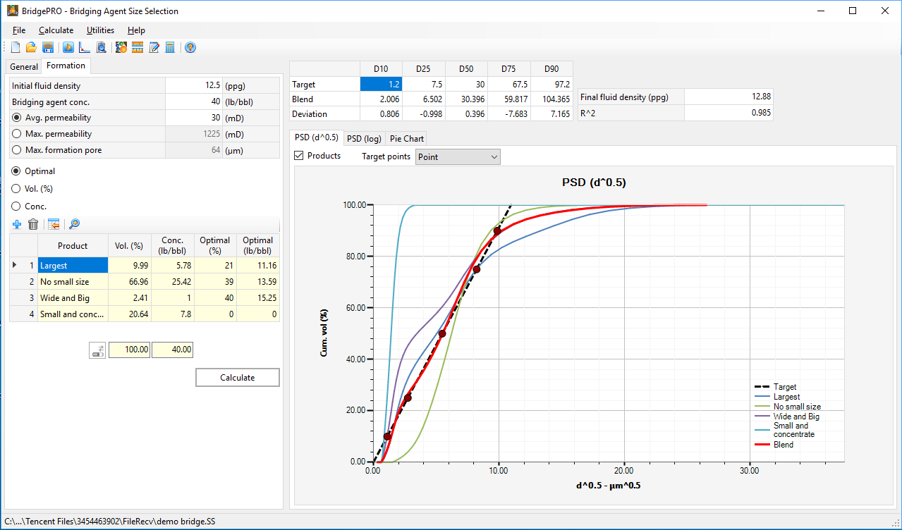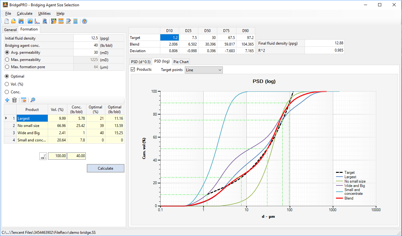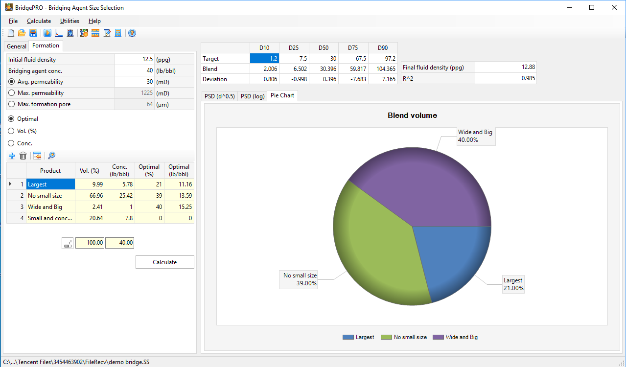 Pegasus Vertex, Inc. has developed BridgePRO, a bridging agent size selection software that aids in the determination of the optimum calcium carbonate blend to achieve maximum bridging of sandstone reservoirs. The software optimization is based on specific formation characteristics and the particle-size distribution of available grades of calcium carbonates.