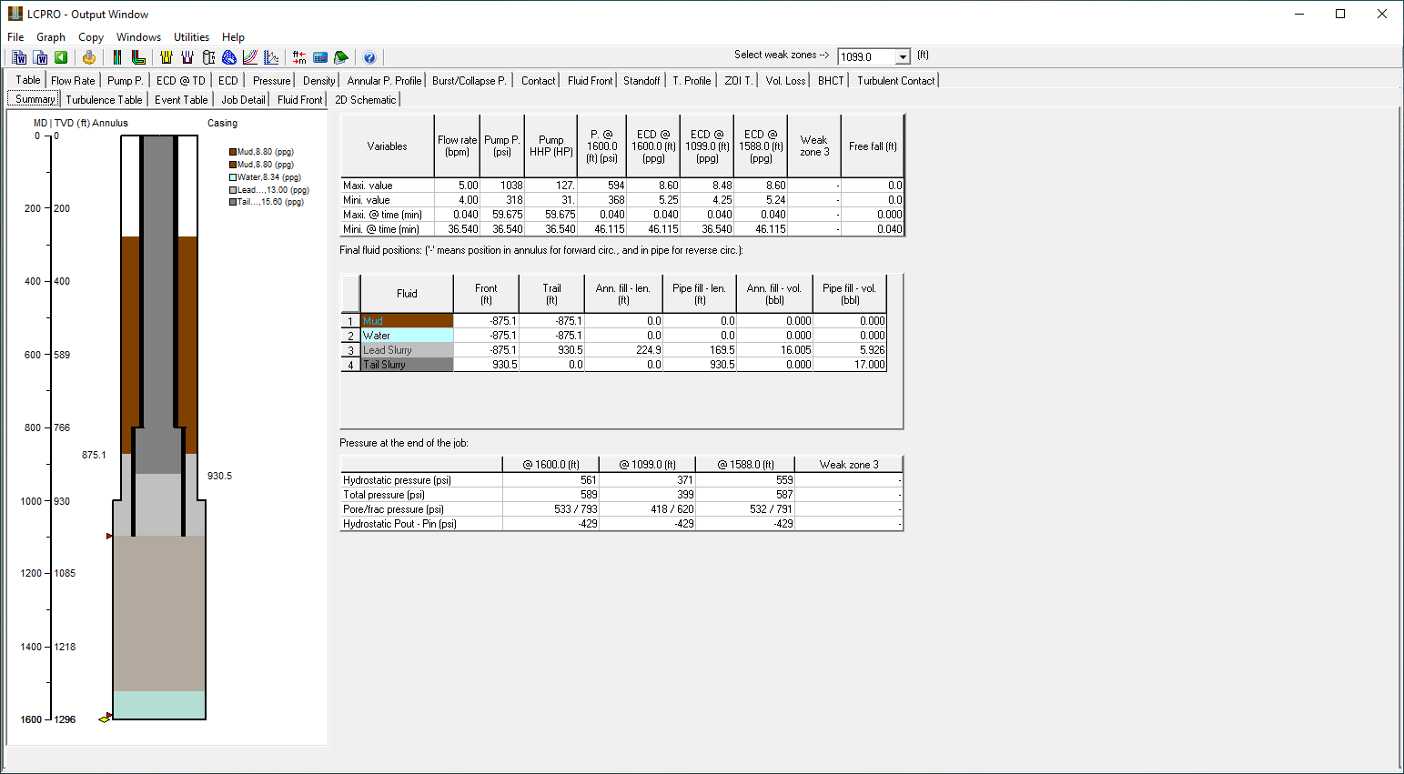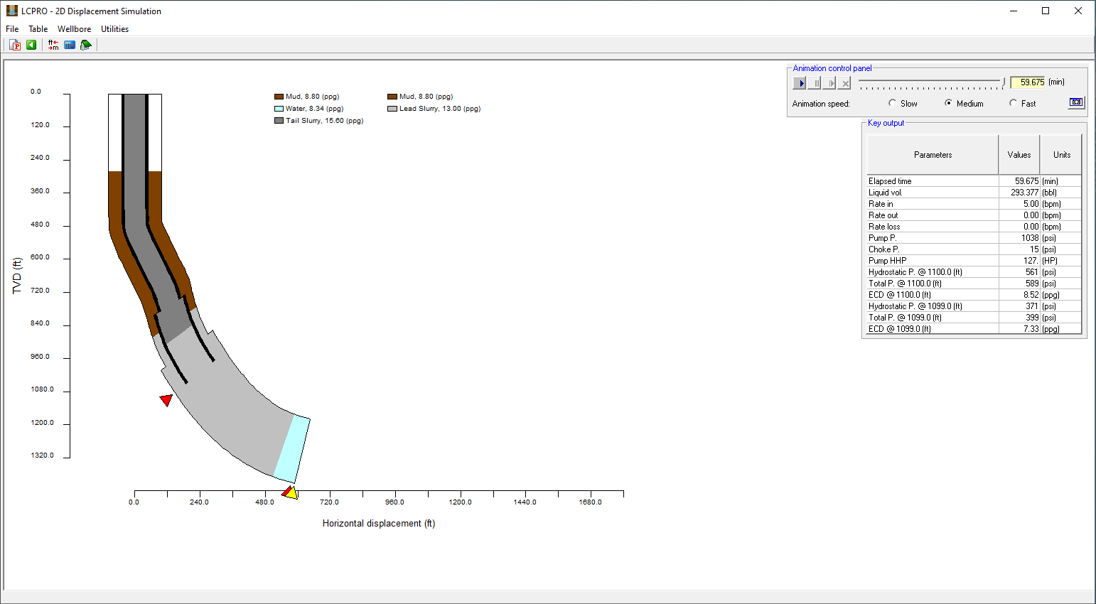Specifically, LCPRO calculates the dynamic pump pressure, ECD and wellbore temperature for multi –fluid displacement. It can also predict the degree of loss of circulation, based on wellbore/formation pressure differential.