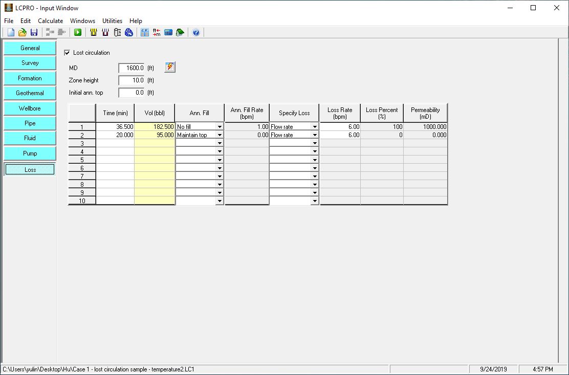 Pegasus Vertex, Inc. developed LCPRO to assist in the design of drilling, cementing, or well treatment operations where lost circulation is present. The simulator models the fluid displacement process with a planned pumping schedule, different loss conditions, and any annular filling operations.