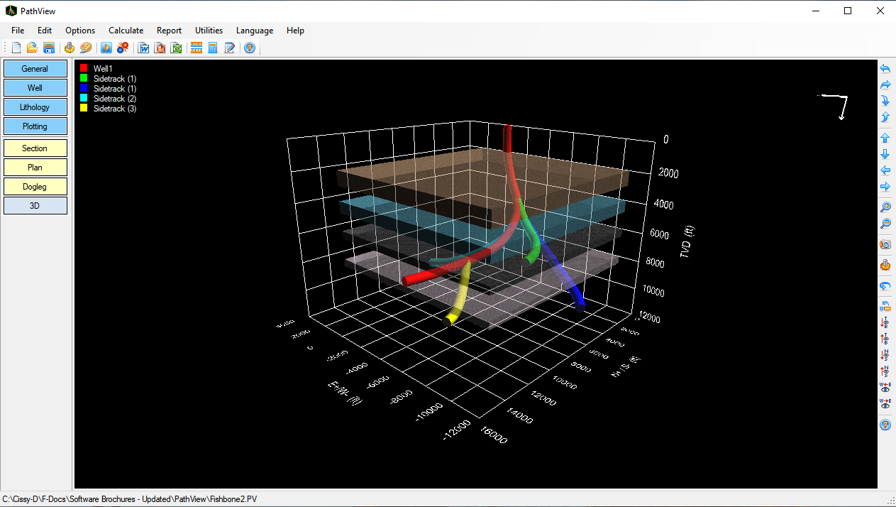 By combining the survey calculations with visualization technology, PathView provides an interactive, true 3D-rendered view of single well, multiple wells, multilateral and multi-level sidetracks. The anti-collision feature accurately calculates the minimum distances between wells and graphically show the distances in 3D space. PathView brings the well path visualization to a new level with options like 3-way projections, curved walls, various transparency, etc.