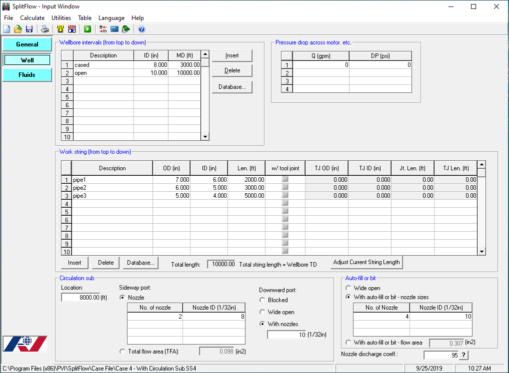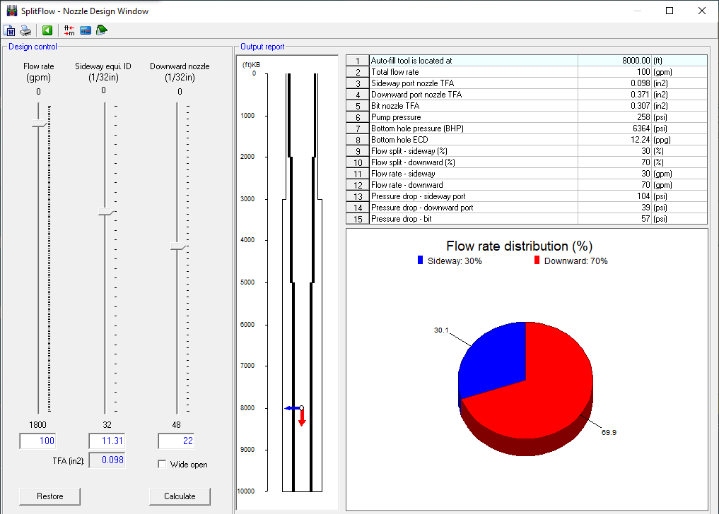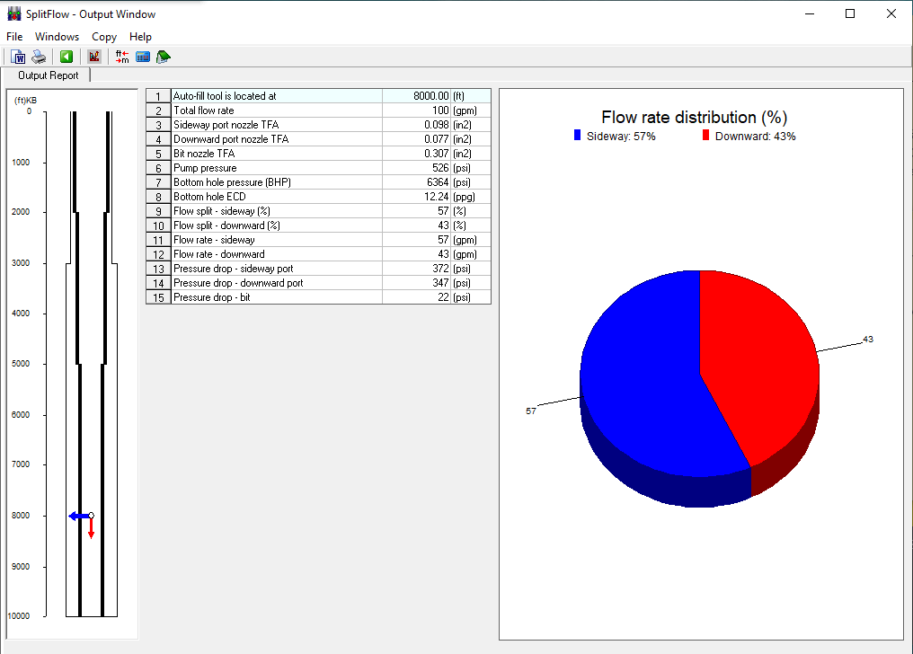 The circulation sub location, sideway and downward ports affect flow split and pressure drops. Pegasus Vertex's SplitFlow model is designed to calculate the hydraulic parameters such as split ratio, pump pressure and pressure drops under different nozzle and bit sizes. SplitFlow can optimize the operation by adjusting tool parameters. Computational results are shown graphically for quick and easy analysis.
